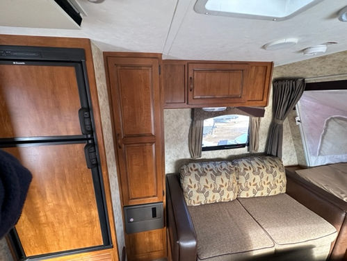 Nice tandem axle hybrid trailer equipped with power awning, large refrigerator and air conditioning.
